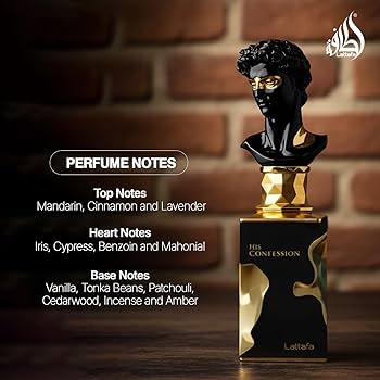 His Confession is a bold, aromatic fragrance with a warm and powdery edge. It opens with a spicy and fresh blend of cinnamon, lavender, and mandarin, transitions into a heart of iris, cypress, benzoin, and mahonial, and finally settles into a rich base of vanilla, tonka, incense, cedarwood, amber, and patchouli.